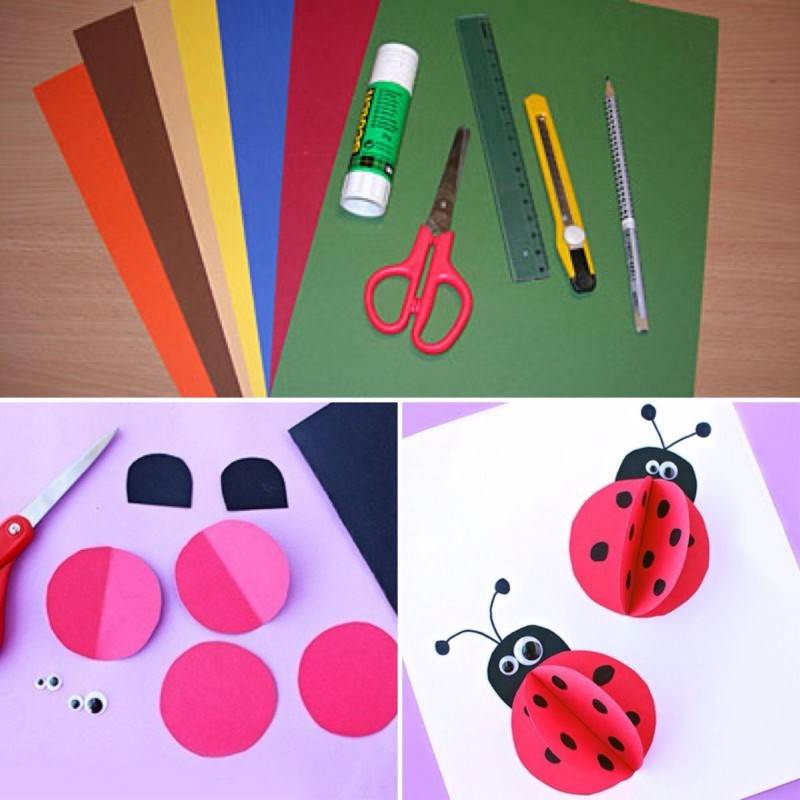 Теперь соберите насекомое по образцу. Сначала приклейте к листочку черные туловище, голову, усики и глазки. Затем добавьте к поделке красные крылышки с черными крапинками.