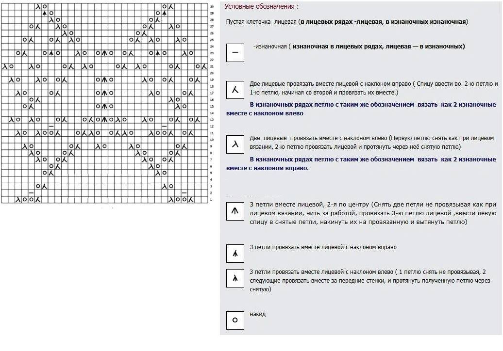 3 ряд: *3 изн., 2 вм.лиц.с наклоном вправо, накид, 3 лиц., накид, 2 вм.лиц.с наклоном влево, 2 изн.*, 1 изн., кром.