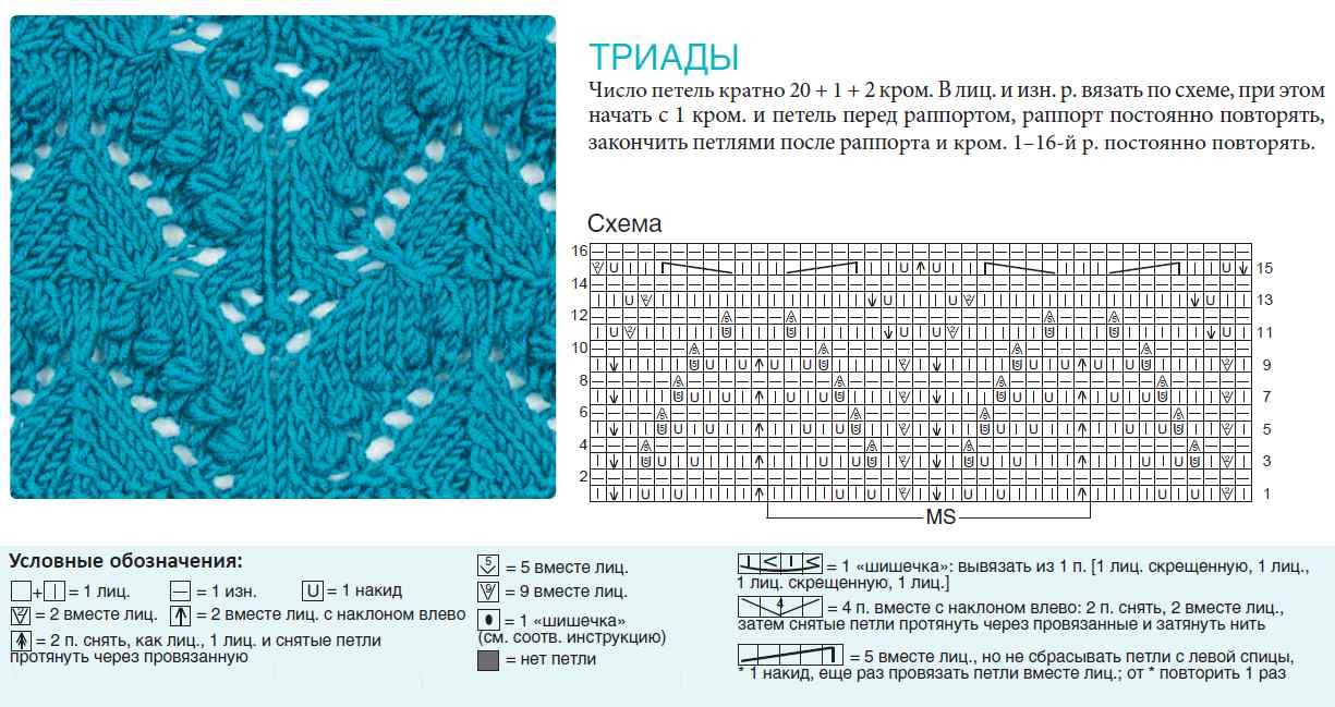 Рапорт узора состоит из 12 петель + 1 петля равновесия + 2 кромочные и 20 рядов в высоту.