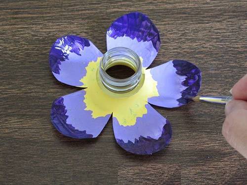 Затем, когда они окончательно просохнут, можно приступать к их покраске. Сначала вы делаете на бутылке разноцветные полосы, в зависимости от того, какой цветок в итоге вы хотите получить.
