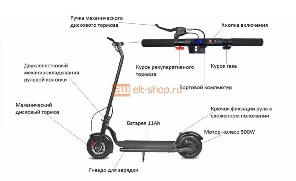 Главное предназначение электрического самоката – передвижение, без применения физических усилий. Эта цель достигается за счет электромотора и аккумулятора. Данные два элемента основополагающие в таком устройстве. От них зависит развиваемая скорость и время поездки.