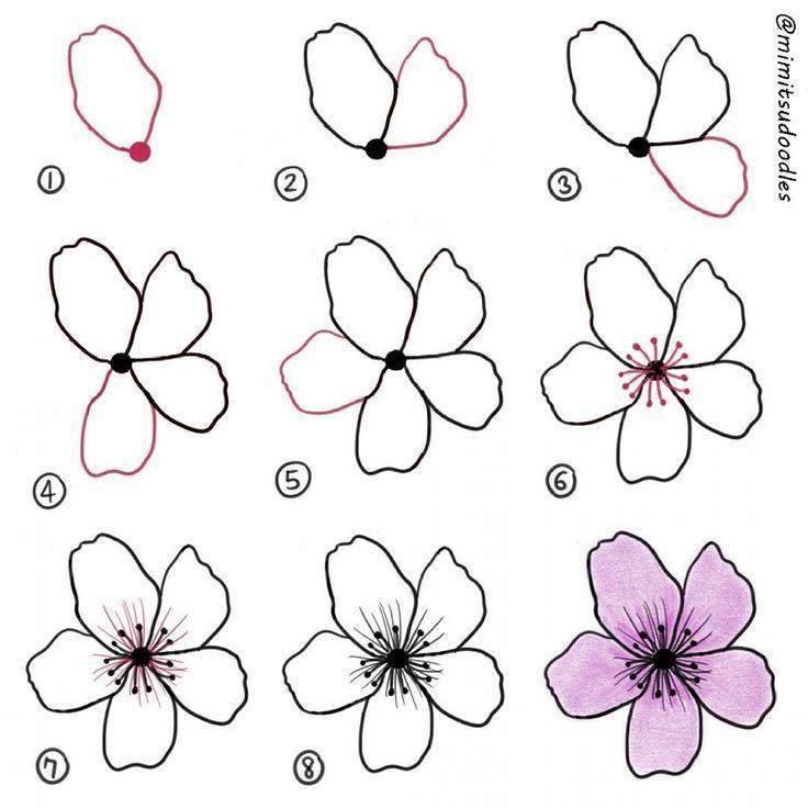 Рисуется второй черешок с листьями. Цветок готов и его останется лишь раскрасить!