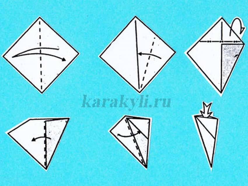 - Получившийся в результате квадрат складывают по диагонали, получается треугольник.