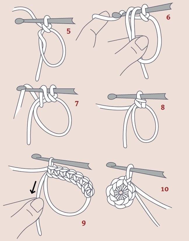 Вытащите рабочую нить и затяните. Эта петля не считается первым столбиком в кольце.