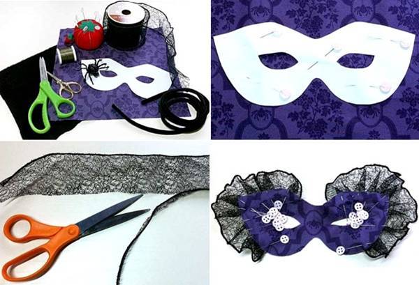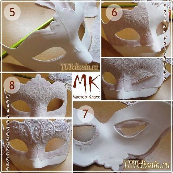 Декорировать поделку можно и с помощью ткани. Для этого нужно предварительно вырезать ткань по форме маски, не забывая при этом о припусках, и прорезать отверстия для глаз и носа. Потом ткань приклеивается к маске прозрачным суперклеем. Обязательно нужно следить, чтобы материал аккуратно ложился на маску, и не появлялись заломы или морщины. Дальше припуски на швы необходимо завернуть внутрь маски и там их закрепить.