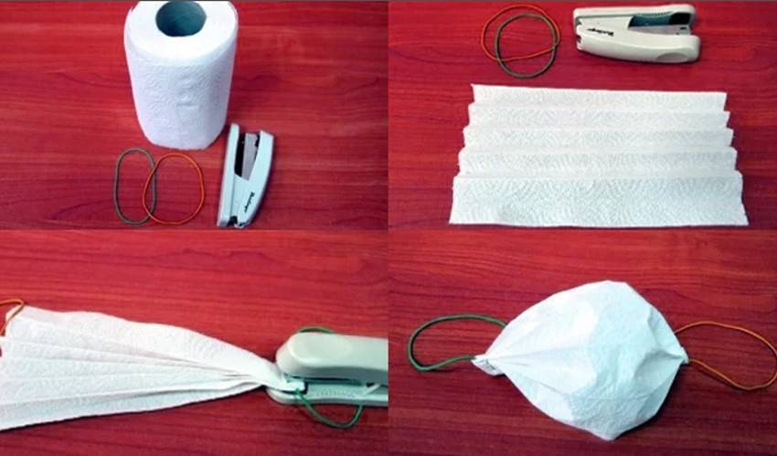 Из бумажных полотенец можно тоже очень быстро сделать защитную повязку. Кроме полотенец нужны ещё канцелярские резинки и степлер со скобами среднего размера.