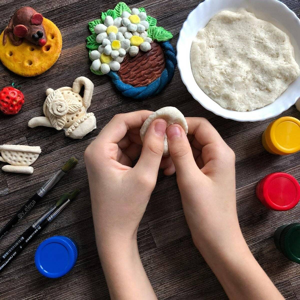 Из соленого теста средней плотности можно создавать поделки с мелкими деталями, например, цветы, фигуры животных, героев мультиков. Можно изготовить поделки для тематической выставки, декор для новогодней елки. Изделия станут ярче, если добавить в тесто краситель, жидкий или порошкообразный. Играть и лепить из цветного теста детям намного интереснее.