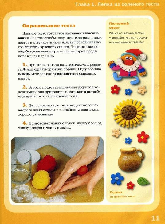 Чтобы в дальнейшем придать поделкам цвет — ведь само по себе тесто желтоватое, а это скучно — можно применить один из способов: